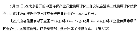南環(huán)公司榮獲中國環(huán)保產(chǎn)業(yè)行業(yè)企業(yè)信用等級評價(jià)AAA級稱號