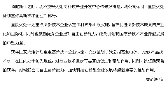 公司榮膺“國家火炬計(jì)劃重點(diǎn)高新技術(shù)企業(yè)”稱號(hào)