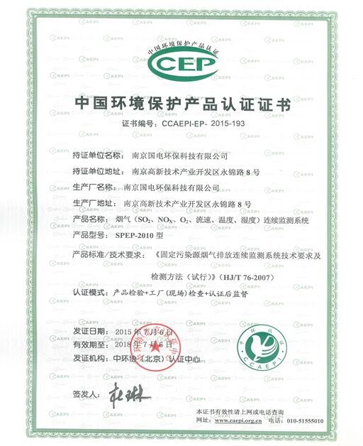 近日,由我公司自行研制的“SPEP-2010型煙氣排放連續監測系統”經中環協(北京)認證中心認證、批準,獲得了中國環境保護產品認證證書,證書編號CCAEPI-EP-2015-193,有效期3年。