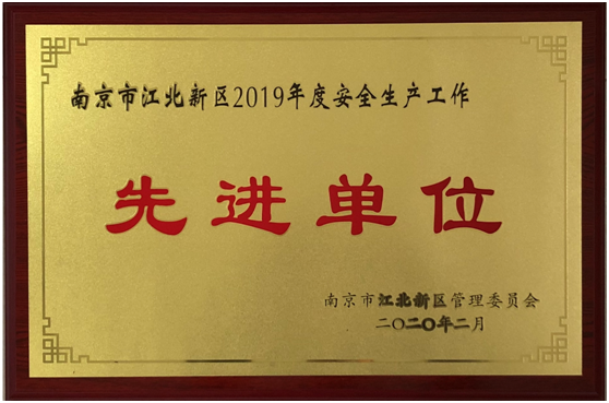 近日,公司被南京市江北新區管理委員會授予“2019年度安全生產工作先進單位”榮譽稱號。